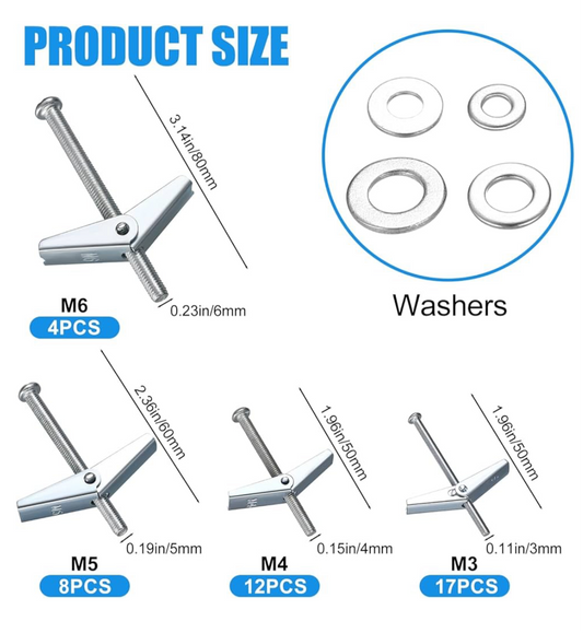 1) 123 Pcs Plasterboard Fixings Screws Sets, Wing Spring Toggle Bolts and Drywall Screws, M3/M4/M5/M6 Spring Toggle Fixings, Hollow Cavity Dry Wall Anchors Screws and Wing Nuts for Plasterboard