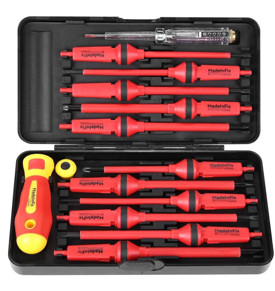 MadeInFix Screwdriver Set, 14 Piece VDE Insulated Electricians Tools Kit with Rubber Handle in Hard Case | Interchangeable | Magnetic Tips | 1000V |